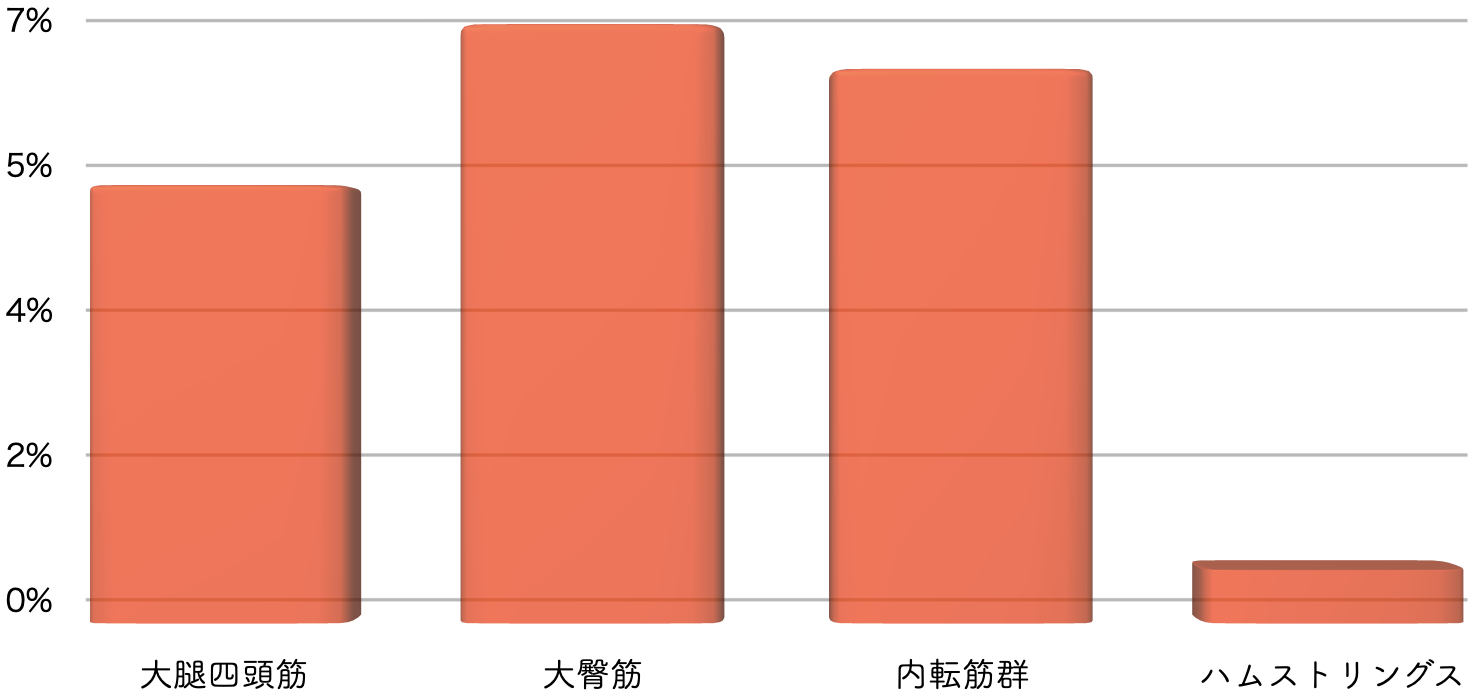 大腿四頭筋は4.9%、大臀筋は6.7%、内転筋群は6.2%増加したのに対し、ハムに関しては有意な変化が認めらなかった。